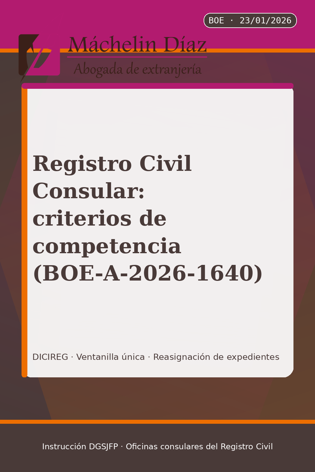El BOE ha publicado la Instrucción de 9 de enero de 2026 de la DGSJFP sobre criterios de competencia en las oficinas consulares del Registro Civil. El objetivo es unificar cómo se atiende, cómo se tramita y cómo se reasignan expedientes en DICIREG. :contentReference[oaicite:0]{index=0}