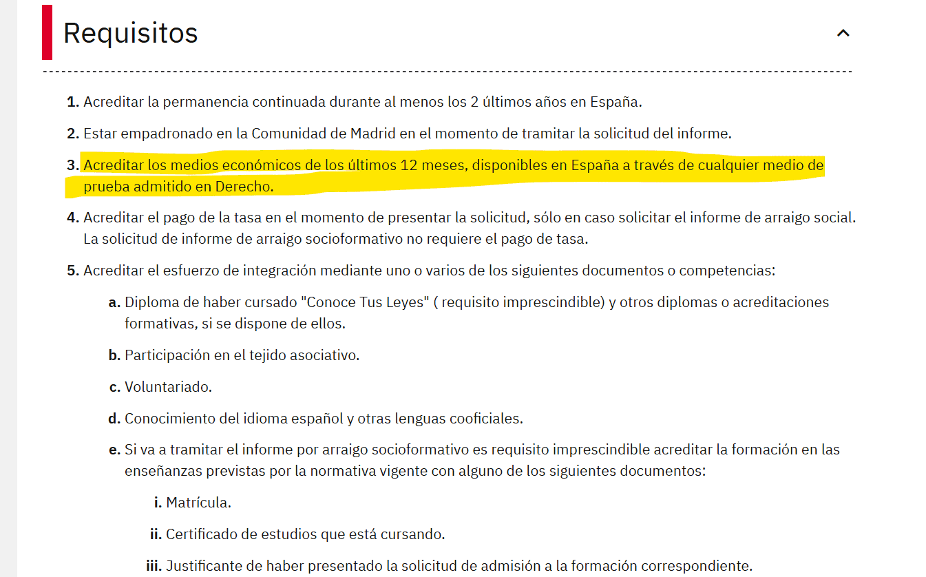 En su portal oficial, la Comunidad de Madrid exige expresamente para el arraigo socioformativo: