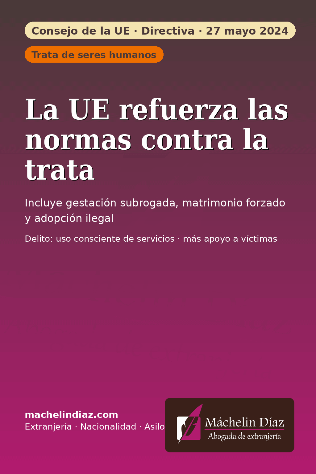 - Se añaden como formas de explotación cubiertas por la normativa UE: explotación de la gestación subrogada, matrimonio forzado y adopción ilegal.